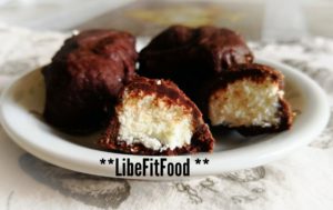 Unire con le mani gli ingredienti tranne il cioccolato. Formare dei piccoli bounty e lasciare in freezer per almeno 30 minuti. Intingerli nel cioccolato e riporre in freezer per altri 10/15 minuti.