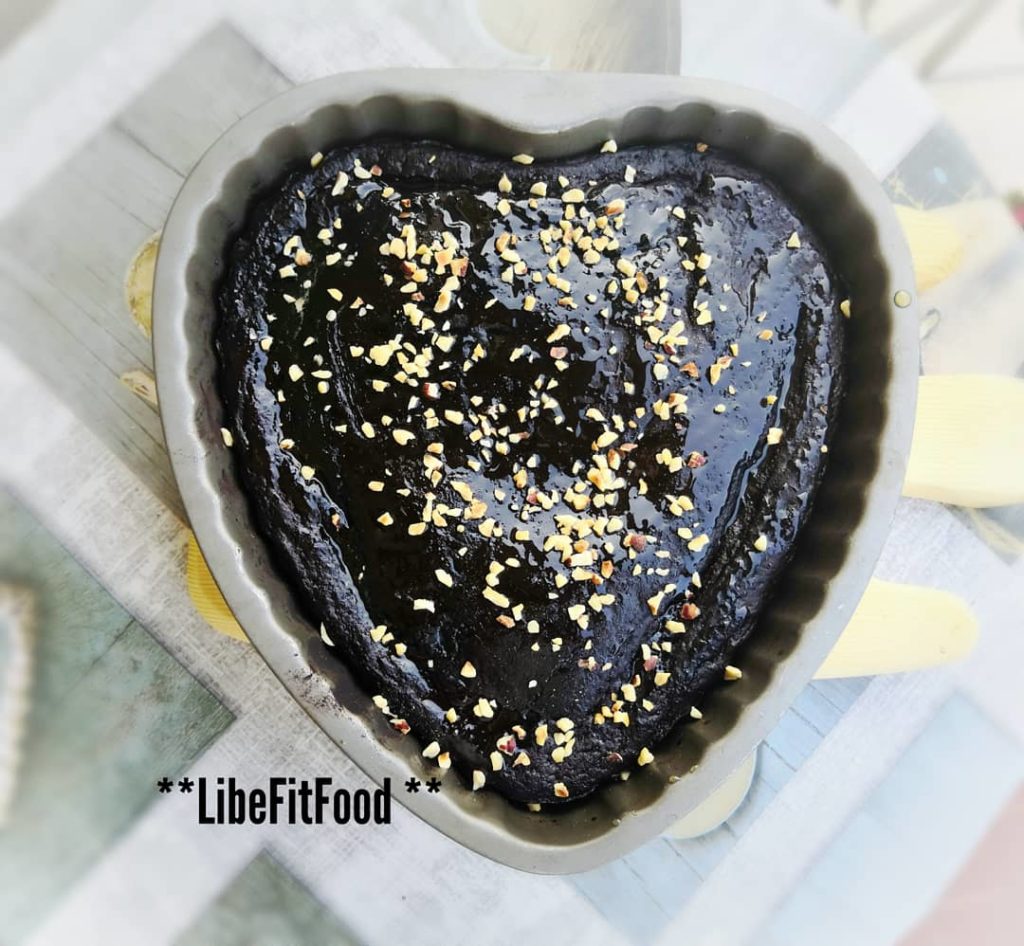 Ho unto una teglia a forma di cuore con olio di cocco e cacao amaro in polvere. Ho versato il composto e lasciato cucinare in forno ventilato per 45 minuti a 180°.