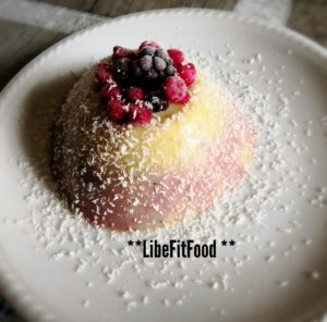 Trasferisco nella coppa solo metà strato. All’altra metà aggiungo i frutti di bosco frullati e verso anche questo composto nella coppa. Sembrerà che tutto si mescoli, ma dopo averlo lasciato almeno una notte in frigo, i due strati saranno divisi e il tutto ben solidificato. A questo punto, capovolgere la tazza e decorare a piacere.