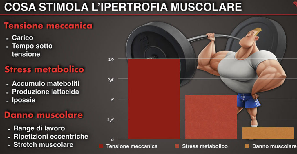 Questa visione dell’allenamento ha sempre funzionato in ambienti doped, dove l’utilizzo di farmaci sostituiva tutti gli altri fattori che influenzano la crescita dell’ipertrofia muscolare. Oggi la fisiologia muscolare ci mostra chiaramente che concorrono tre fattori all’aumento della massa muscolare: