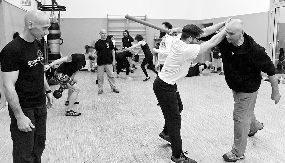 Sopra una foto della parte pratica sull’utilizzo di tecniche di autodifesa contro un’aggressione diretta. In questi casi si può evincere come la componente di abilità coordinative e condizionali sia fondamentale per esprimere a pieno il gesto tecnico A seconda del tempo di contatto con l’avversario cambierà il tempo di applicazione della forza massima. Esso sarà minore se il gesto tecnico da esprimere avrà coinvolte solo percussioni veloci senza la vera e propria fase di contatto corpo a corpo.
