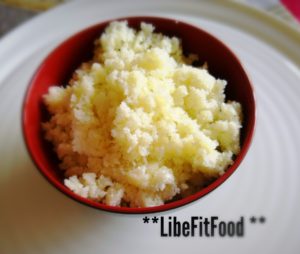 Lavo bene una porzione di cavolfiore e la trito nel tritatutto. La posizione in un piatto capiente adatto al microonde e copro con pellicola trasparente. Lascio cucinare con funziona normale per 4 minuti circa (fino alla consistenza desiderata, più si cucina più sarà morbido).