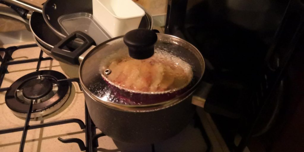 A questo punto metto dell’acqua in una pentola, posizione la teglia in ceramica dentro alla pentola, copro con coperchio e lascio cucinare sul fuoco a fiamma bassa. Dopo 10/15 minuti aggiungo le mele sopra il tortino e continuo a cucinare per altri 30/35 minuti.